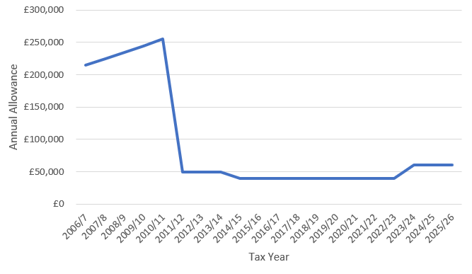 For 2006/07, this was set at £215,000, and then increased by £10,000 a year until 2010/11, when the Annual Allowance was set at £255,000. Quite the jump from £37,000 pre-2006!