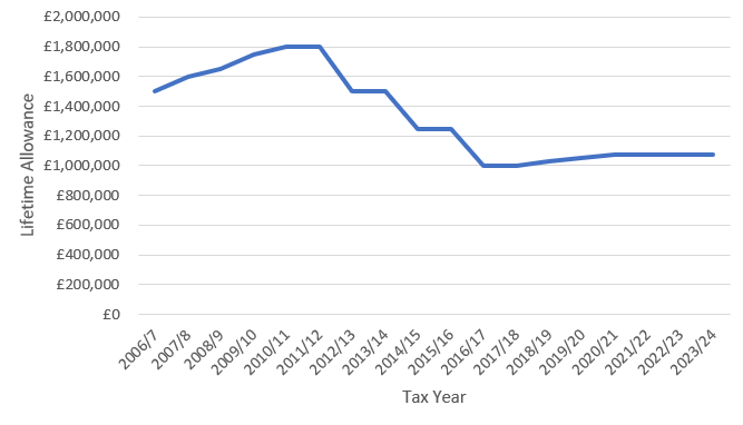 As with the Annual Allowance, the government probably thought that an ever-increasing LTA was a bit too generous. So, they announced a downward reversal from 2012, dropping the LTA to £1.5 million in 2011/12, all the way down to £1 million in 2018. This then began to creep back up to the limit we had in 2023 of the very catchy and memorable £1,073,100.